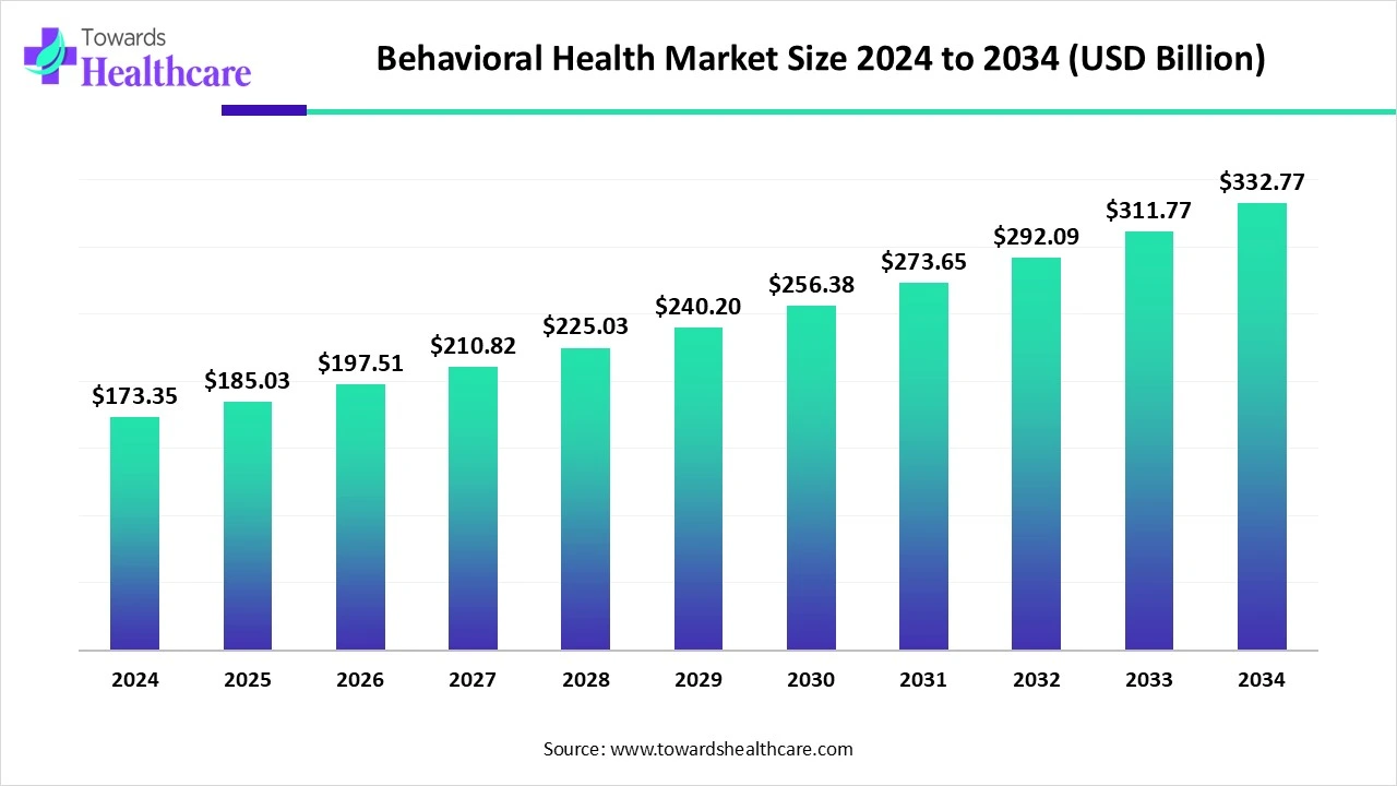 • The global behavioral health market is valued at USD 173.35 billion in 2024 and is projected to reach USD 332.77 billion by 2034, growing at a CAGR of 6.74%.